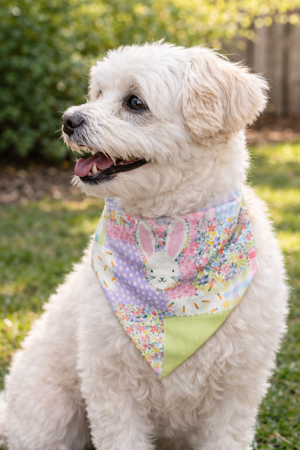 Bring a touch of spring fun to your pupās wardrobe with this Easterāthemed slipāoverātheāhead dog bandana. Made with soft, lightweight fabric and a comfortable gathered neckline, this bandana slides easily over your dogās head for a secure, noāfuss fit. The playful patchwork design features bright spring patterns, cheerful colors, and an adorable bunny illustration that gives it a festive, boyish charm.