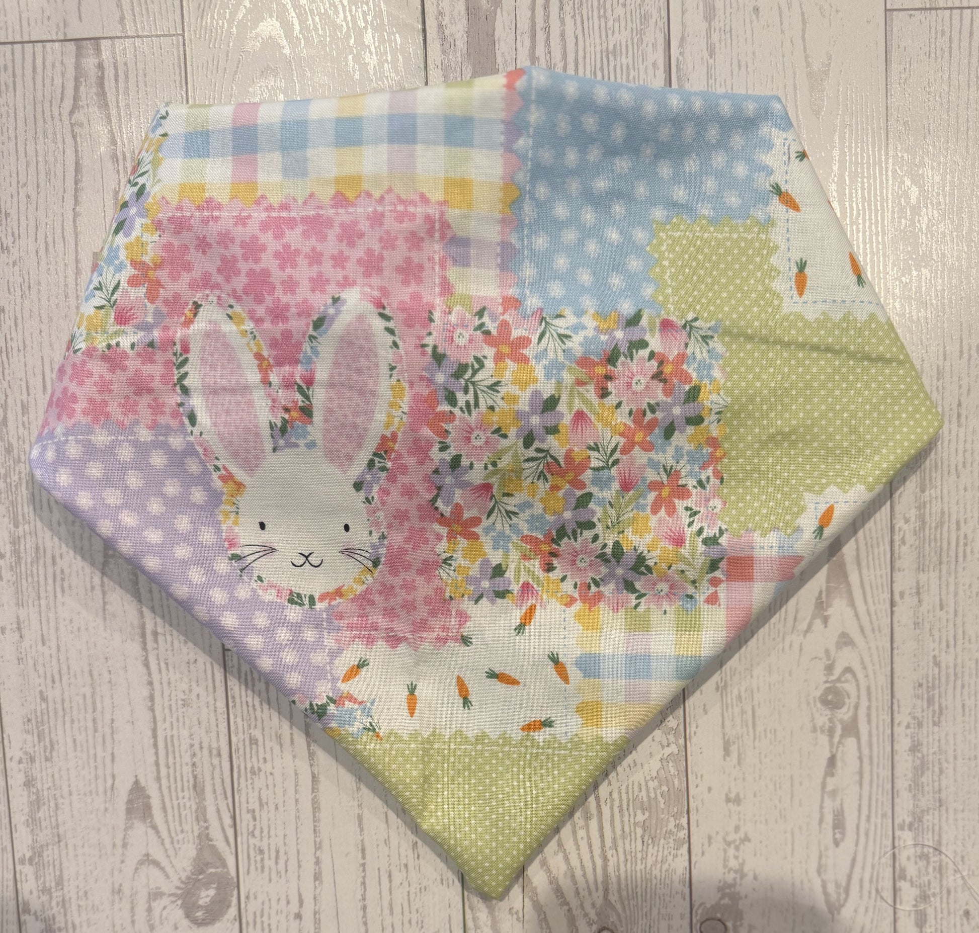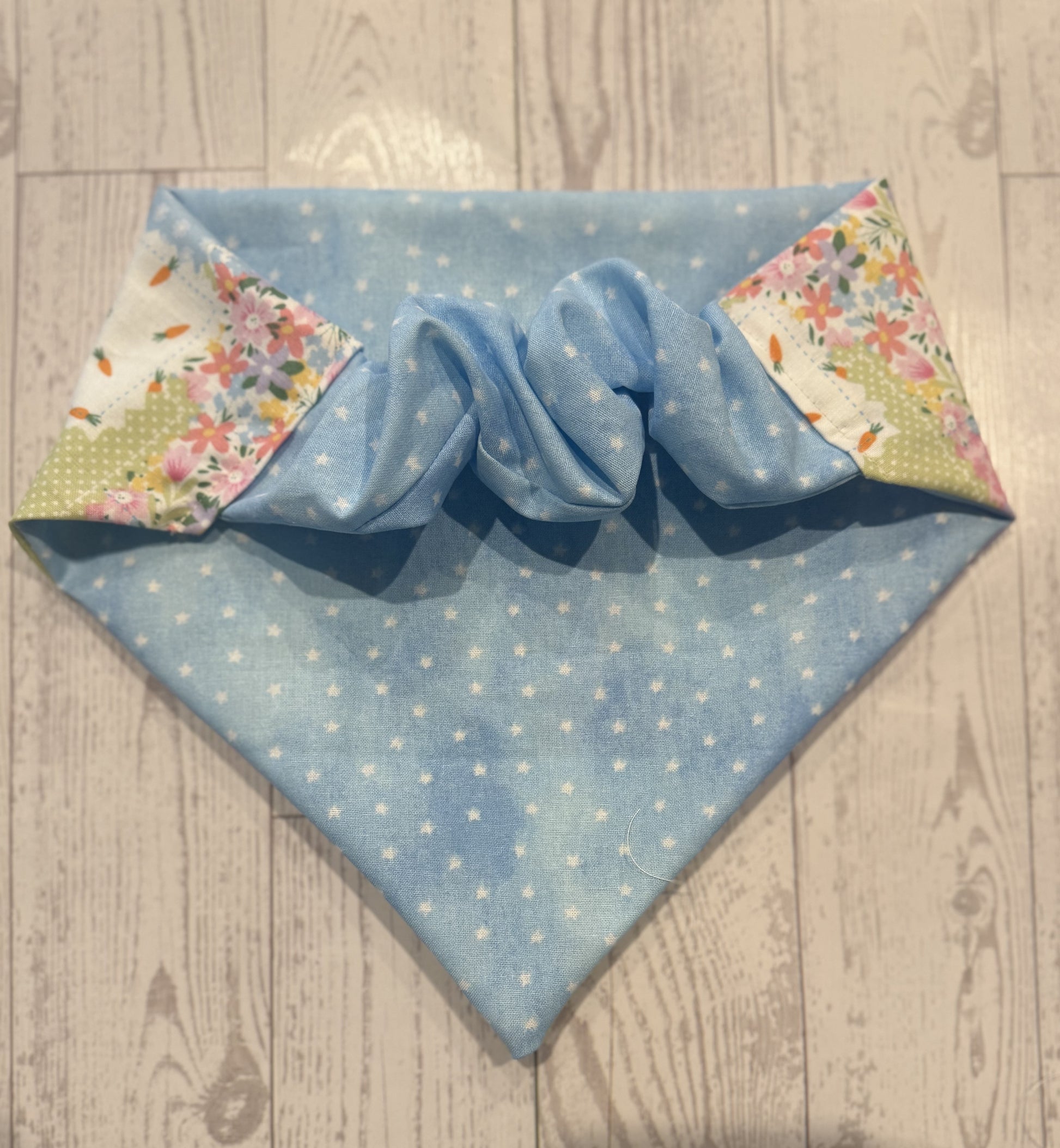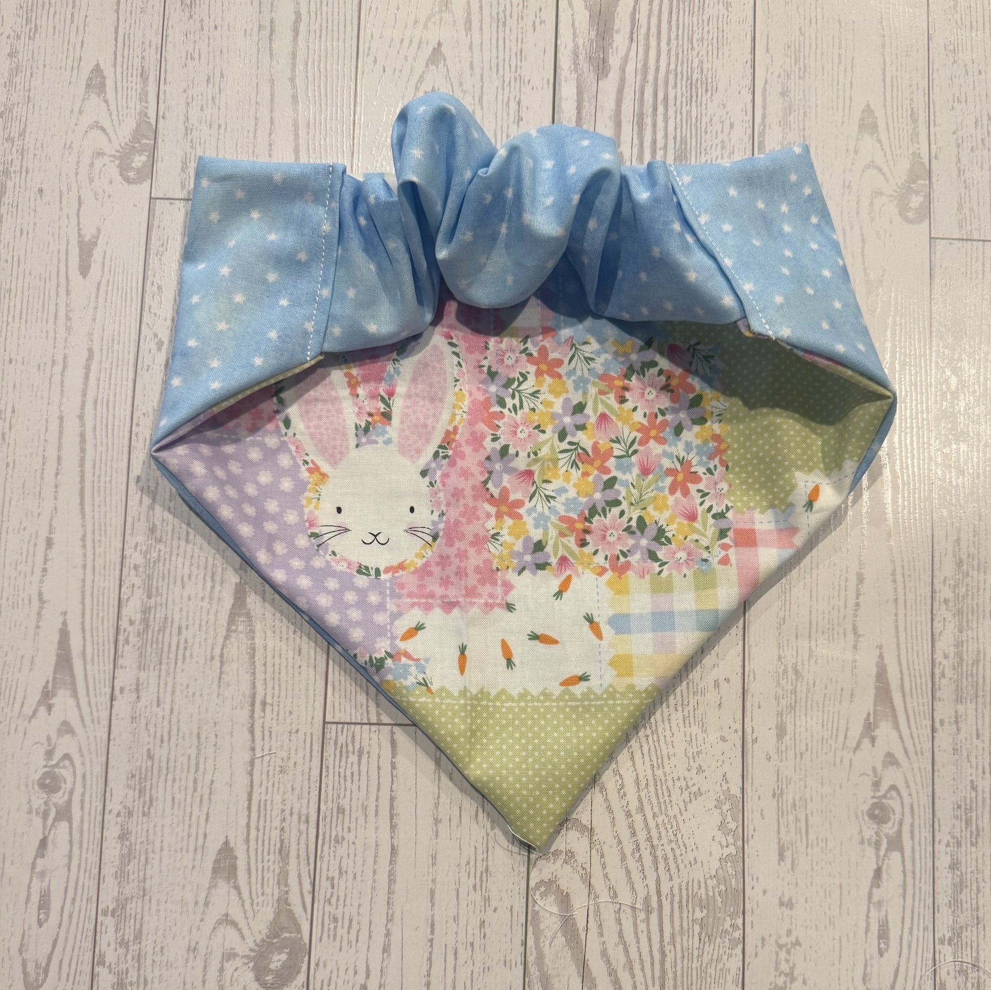 The reverse side is finished with blue polkaādot fabric, adding a crisp, classic touch that complements the Easter theme and gives the bandana a clean, polished look from every angle.